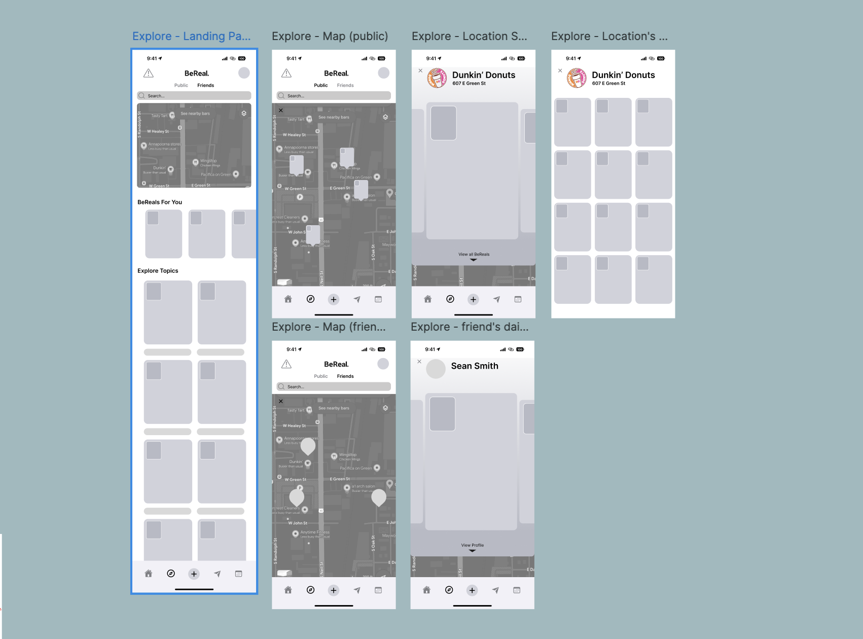 Redesigned low-fidelity wireframes of BeReal's mapping feature to have new features such as a private and public toggle.