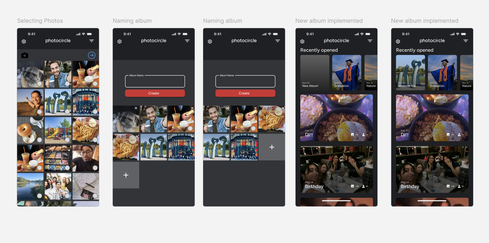 Prototyped and A/B tested lo-fi wireframes for features like album creation and calendar view. Insights showed users prefered photo filters and find a search tool convenient.